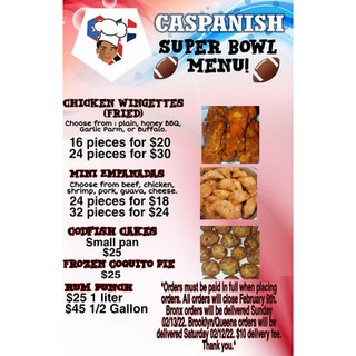 Super Bowl Menu is here. Place your orders asap. Orders will close February 9th. Deliveries to Brooklyn/Queens will be Saturday February 02/12/22. Deliveries to the Bronx will be 02/13/22. Thank you. #superbowl #football #food #chickenwings #wings #empanadas #goodies #yummy #caspanish #eat #menu